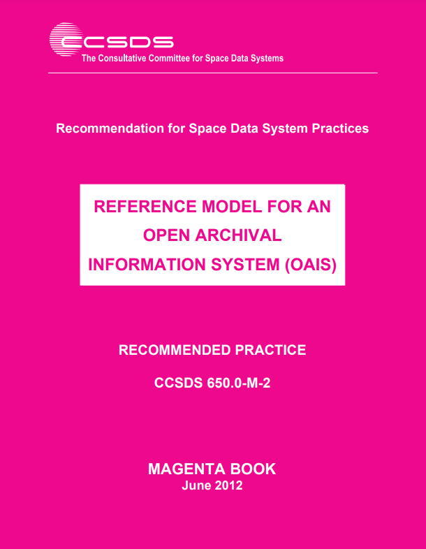 presenter notes The Reference Model for an Open Archival Information System (OAIS) document was developed for use in facilitating a broad, discipline-independent consensus on the requirements for an archive or repository to provide long-term preservation of digital information. It is sometimes referred to as the “Magenta Book” because of the color of its cover page.