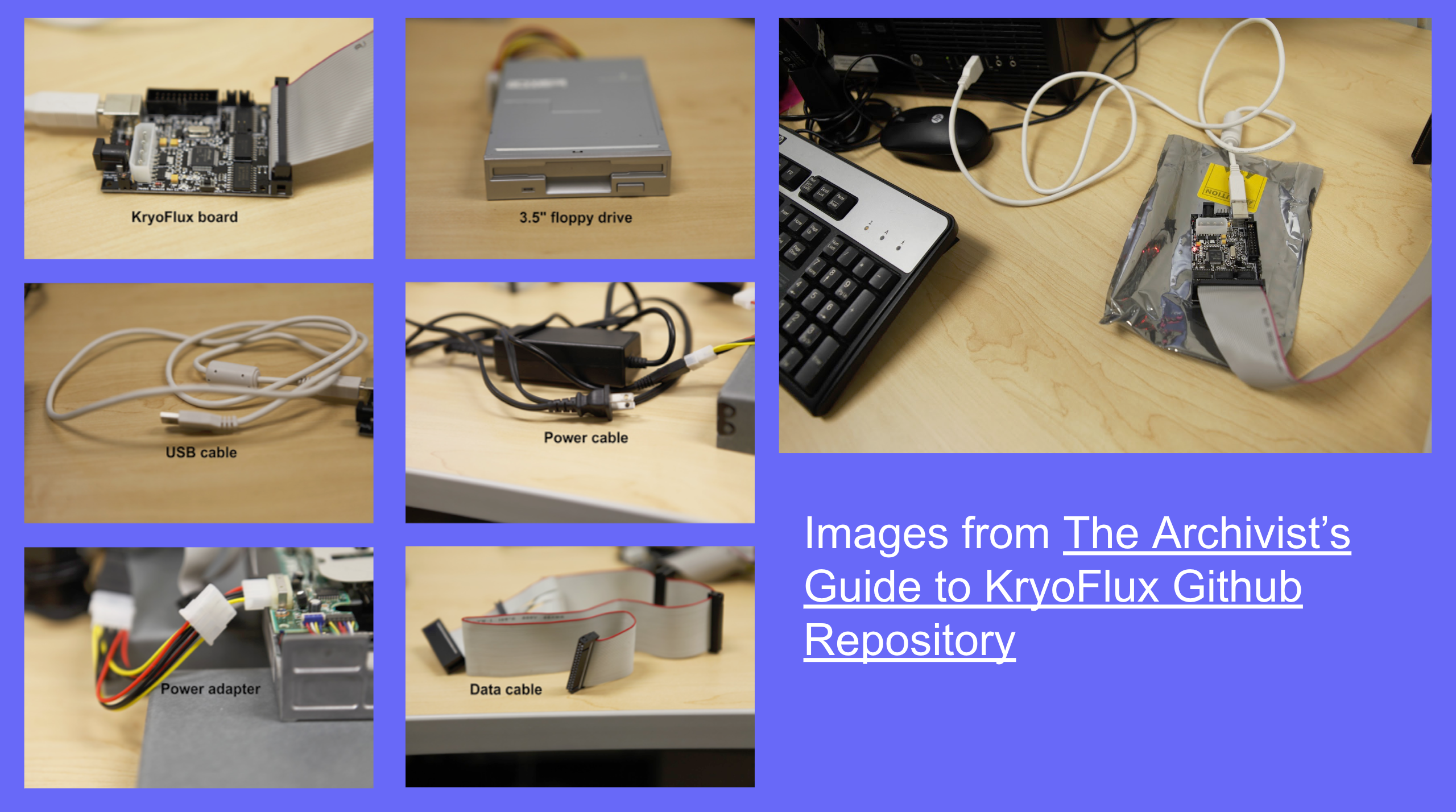 presenter notes Sometimes, imaging fails, and we have to use other devices and tools at our disposal to get the bitstream. On the slide is a KryoFlux controller card. These images were taken from a Github repo called “The Archivist’s Guide to KryoFlux”, which was a collaborative document written by several digital archivists from different repositories. You have several components. Starting from the top left going from left to right, is the KryoFlux board, which looks like an exposed computer chip. The KryoFlux board is connected to the floppy drive using a data cable. The data cable size will depend on the type of drive you are transferring from. The image on the slide shows a 3.5” floppy drive, but a KryoFlux board can be connected a multitude of floppy drives. Once your floppy drive is connected to the KryoFlux board, you will next connect the board to your computer using a USB cable. Once your drive and board are connected to your computer, you launch the tool via the command line. Once this is done, you connect your floppy drive to an power source using a power adapter. Again, depending on the drive you are using for imaging, you will use a different power adapter. This ultimately enabled Emory to capture all of Walkers disks. Why did the KryoFlux work so much better? KryoFlux is known to be able to capture disk images of a variety of formats. Along with the KryoFlux card, you will need to install the Disk Tool Controller (DTC) software. DTC is used to control the board and interact with floppy disk drives and provides a user-friendly interface for controlling the board and performing various disk-related tasks. This software is available for various operating systems, including Windows, Linux, and macOS.