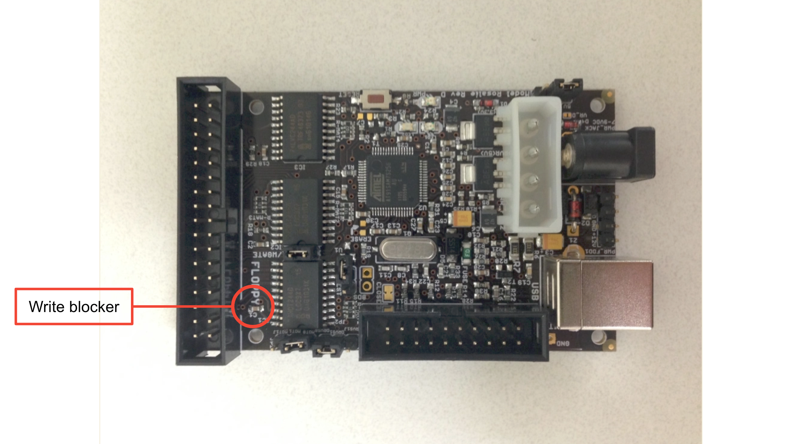 presenter notes Here is a close-up photo of the KryoFlux board, which comes with a built-in write-blocker, circled in red. To enable write-blocking functionality, you would actually physically remove the jumper for the write gate.