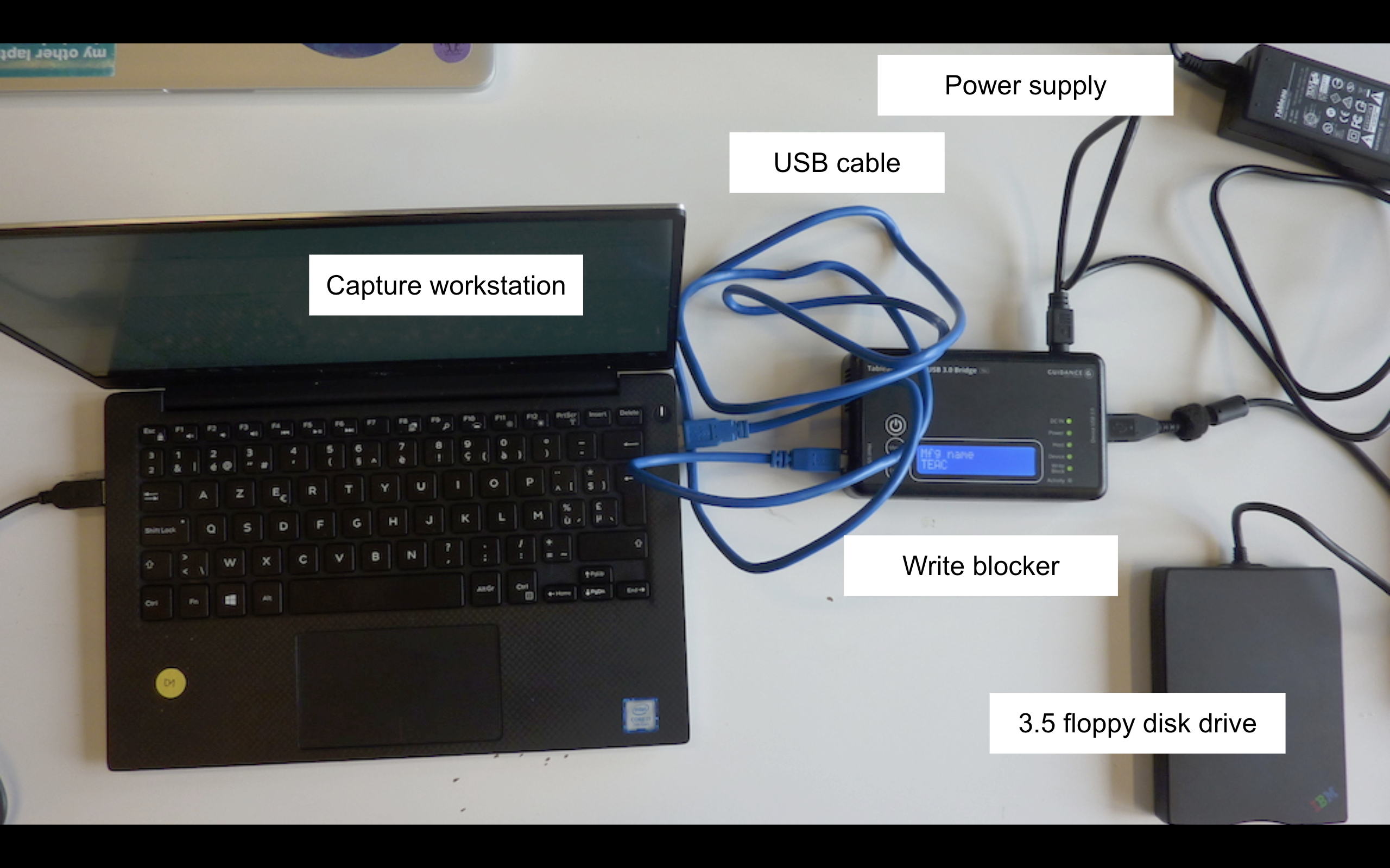 presenter notes What does a disk imaging workstation look like? - Dedicated capture workstation: A laptop or desktop computer used for disk imaging. - Write blocker: A hardware device that sits between the capture workstation and the disk reader, preventing accidental modification of the source media. - Disk reader: A device that reads the physical media (e.g., a floppy disk drive for floppy disks). - Various cables connect the workstation, write blocker, and disk reader to each other, ensuring proper data transfer, and to power.